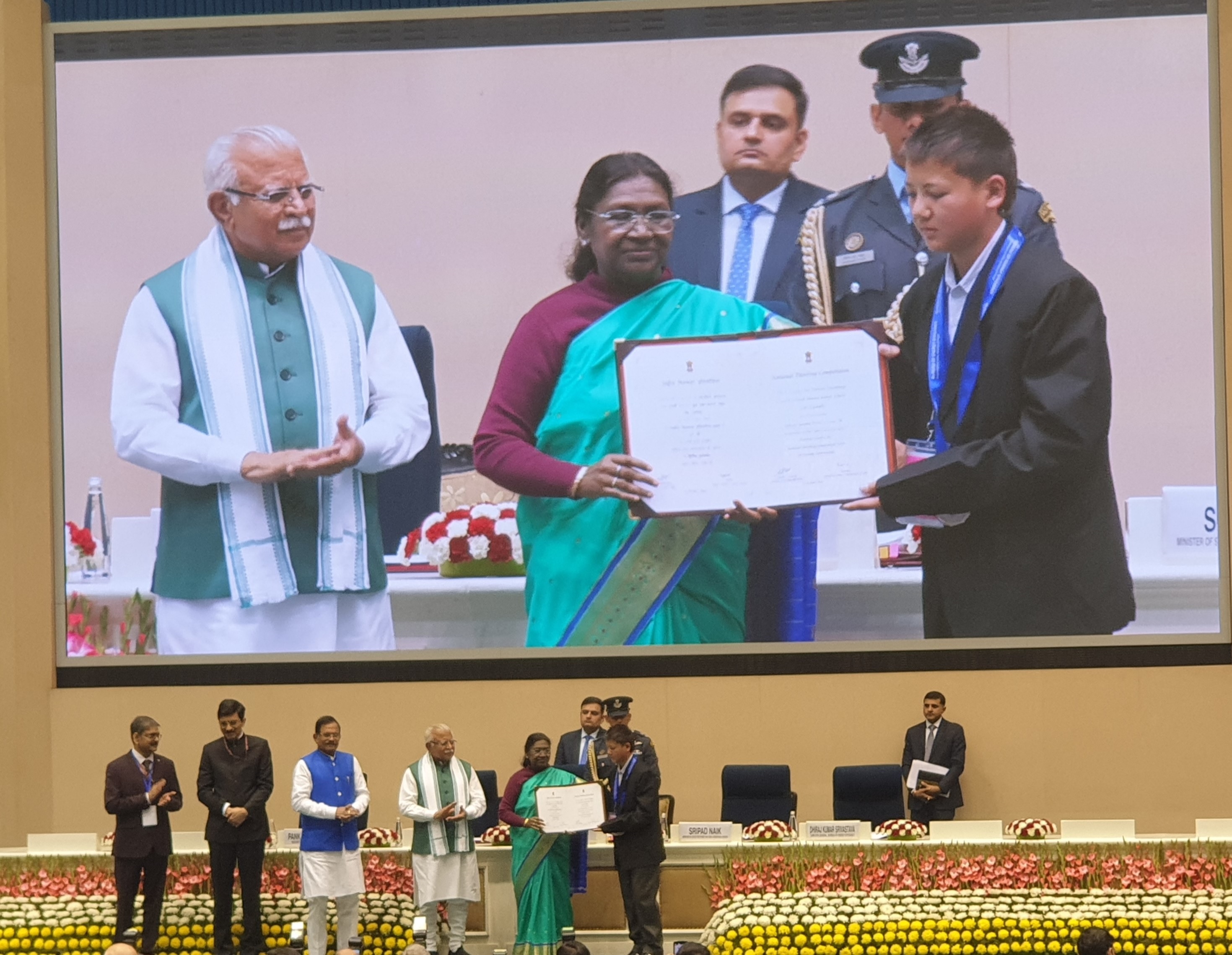 भारत की माननीय राष्ट्रपति श्रीमती द्रौपदी मुर्मु ने ऊर्जा संरक्षण विषय पर श्रेणी “बी” के अंतर्गत उत्कृष्ट चित्रकला के लिए मास्टर स्टैंजिन चोसयांग्स को जोकि ड्रुक पद्मा कार्पो स्कूल, शेय, लेह, केंद्र शासित प्रदेश लद्दाख के कक्षा दसवीं के छात्र है , को ₹50,000/- का द्वितीय पुरस्कार, रजत पदक तथा एक लैपटॉप प्रदान किया। यह पुरस्कार