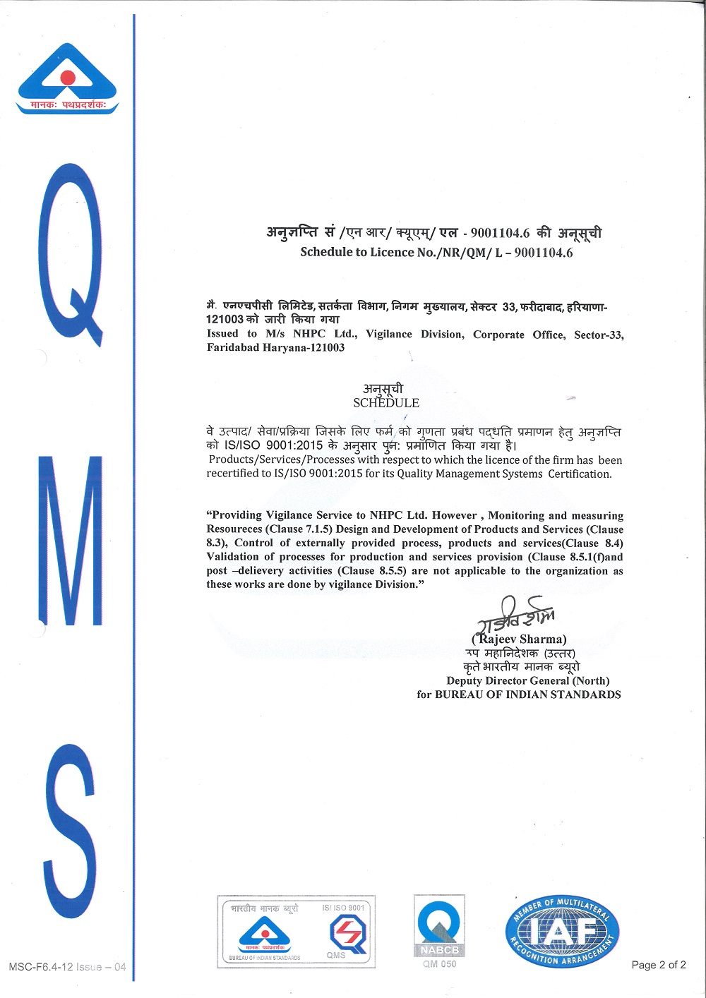 Vigilance Division of NHPC Ltd, has established an QUALITY MANAGEMENT SYSTEM (QMS) which meets the requirements of ISO 9001: 2015. The system has been implemented in relation to all the activities of Vigilance Division.